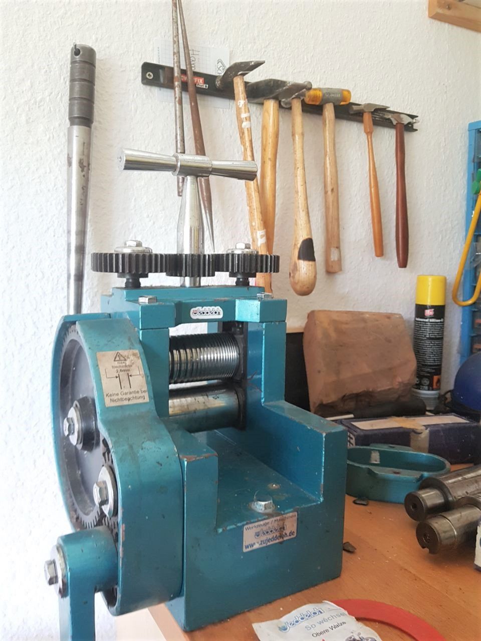 Nicht nur das Kreative gehört zur Arbeit eines Goldschmieds, sondern auch das Handwerkliche. Um ein Schmuckstück entstehen zu lassen muß man oft stunden- oder tagelang konzentriert werken. Löten, Feilen, Schmirgeln, Biegen, Sägen und Fassen ist dabei der eher feinere Teil des Entstehungsprozesses, während es beim Schmelzen, Walzen, Ziehen und Hämmern schon gröber zu geht.